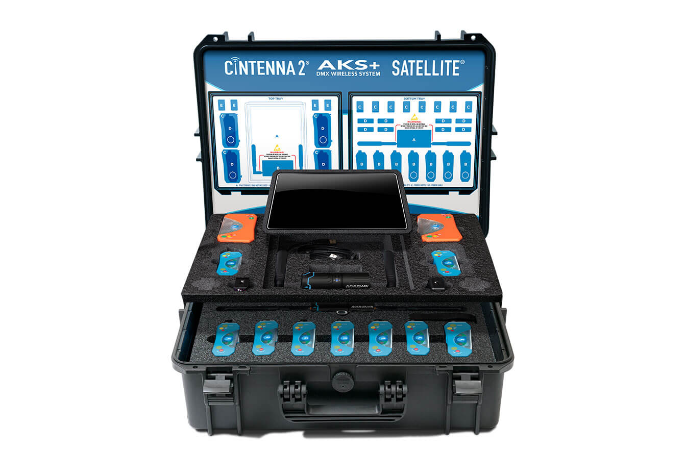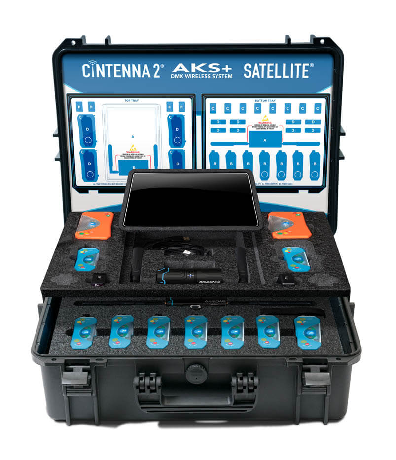Our large Satellite®/AKS+/ Cintenna 2® Pro Kit allows you to control multiple universes of data and transmit wireless to multiple fixtures. The top layer of this kit is configurable with perforated slots: allowing you to choose what devices you want on top. Up to 4 Cintenna 2’s can be added here or 4 Satellites, it’s up to you. The bottom foam can accommodate either 7 more Cintenna’s or 7 more Satellites, depending on your needs.