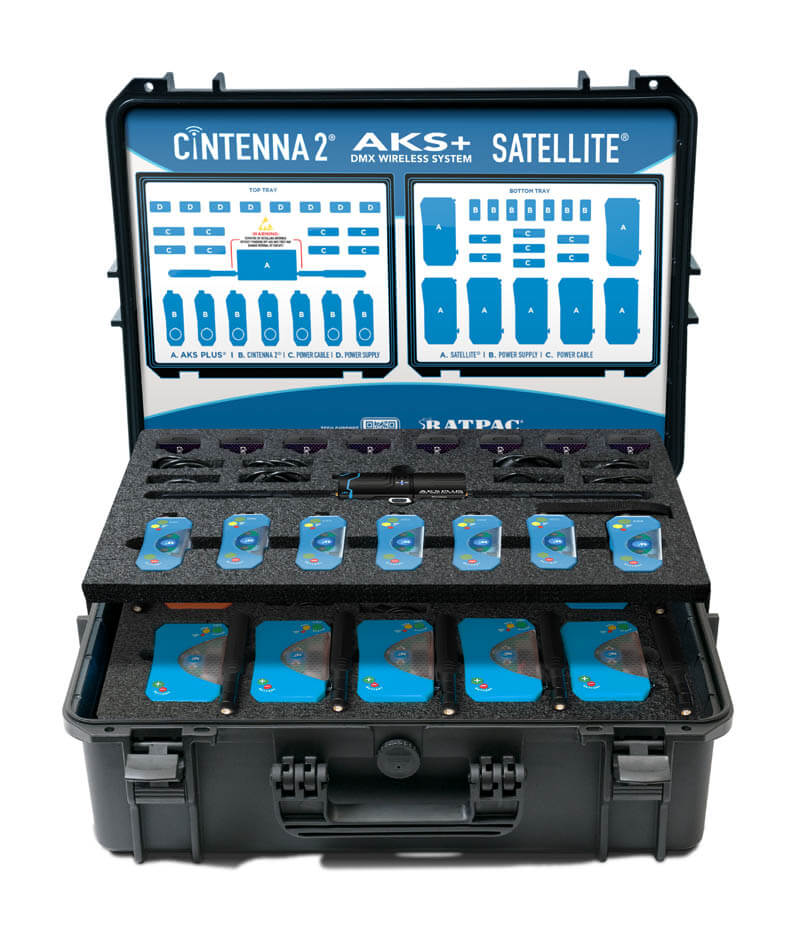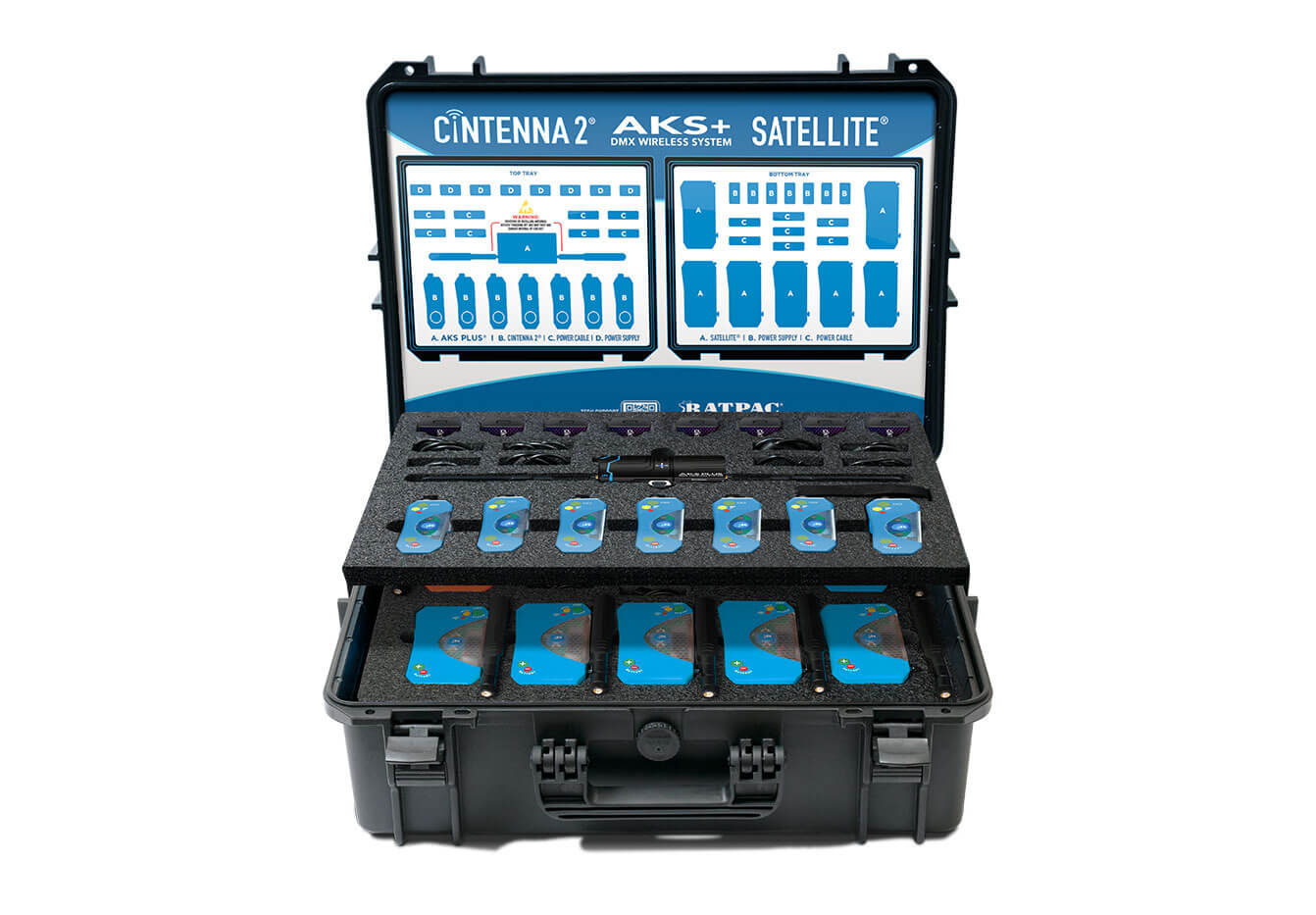 Our large Satellite®/Cintenna 2®/AKS+ Kit allows you to control up to 7 universes of DMX wirelessly or Via Ethernet. The Kit provides a slot for the AKS+, 7 slots for our new Satellite® and 7 Cintenna 2®, a splash resistant DMX receiver. An RGB LED illuminates a translucent window linking the color of your transmitter and your receiver to indicate which universes your working in. Need more universes of data? Just add more Satellites and control as many as you like via Art-Net and sACN. Data hungry fixtures have changed the way we manage data and Satellite® is the answer!