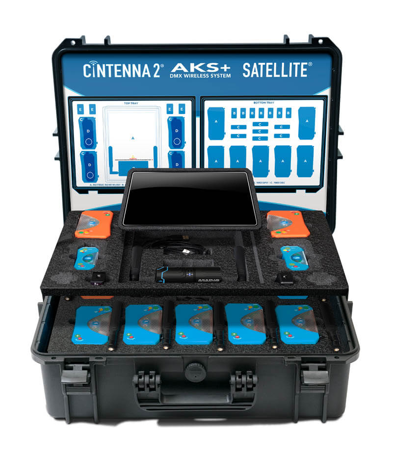Our large Satellite®/AKS+/ Cintenna 2® Pro Kit allows you to control multiple universes of data and transmit wireless to multiple fixtures. The top layer of this kit is configurable with perforated slots: allowing you to choose what devices you want on top. Up to 4 Cintenna 2’s can be added here or 4 Satellites, it’s up to you. The bottom foam can accommodate either 7 more Cintenna’s or 7 more Satellites, depending on your needs.