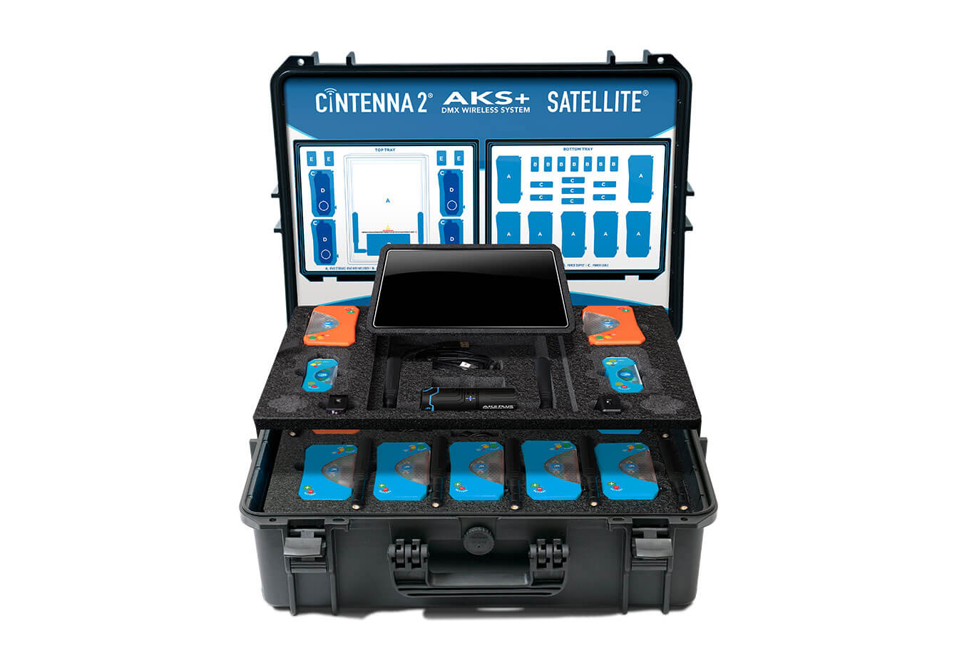 Our large Satellite®/AKS+/ Cintenna 2® Pro Kit allows you to control multiple universes of data and transmit wireless to multiple fixtures. The top layer of this kit is configurable with perforated slots: allowing you to choose what devices you want on top. Up to 4 Cintenna 2’s can be added here or 4 Satellites, it’s up to you. The bottom foam can accommodate either 7 more Cintenna’s or 7 more Satellites, depending on your needs.